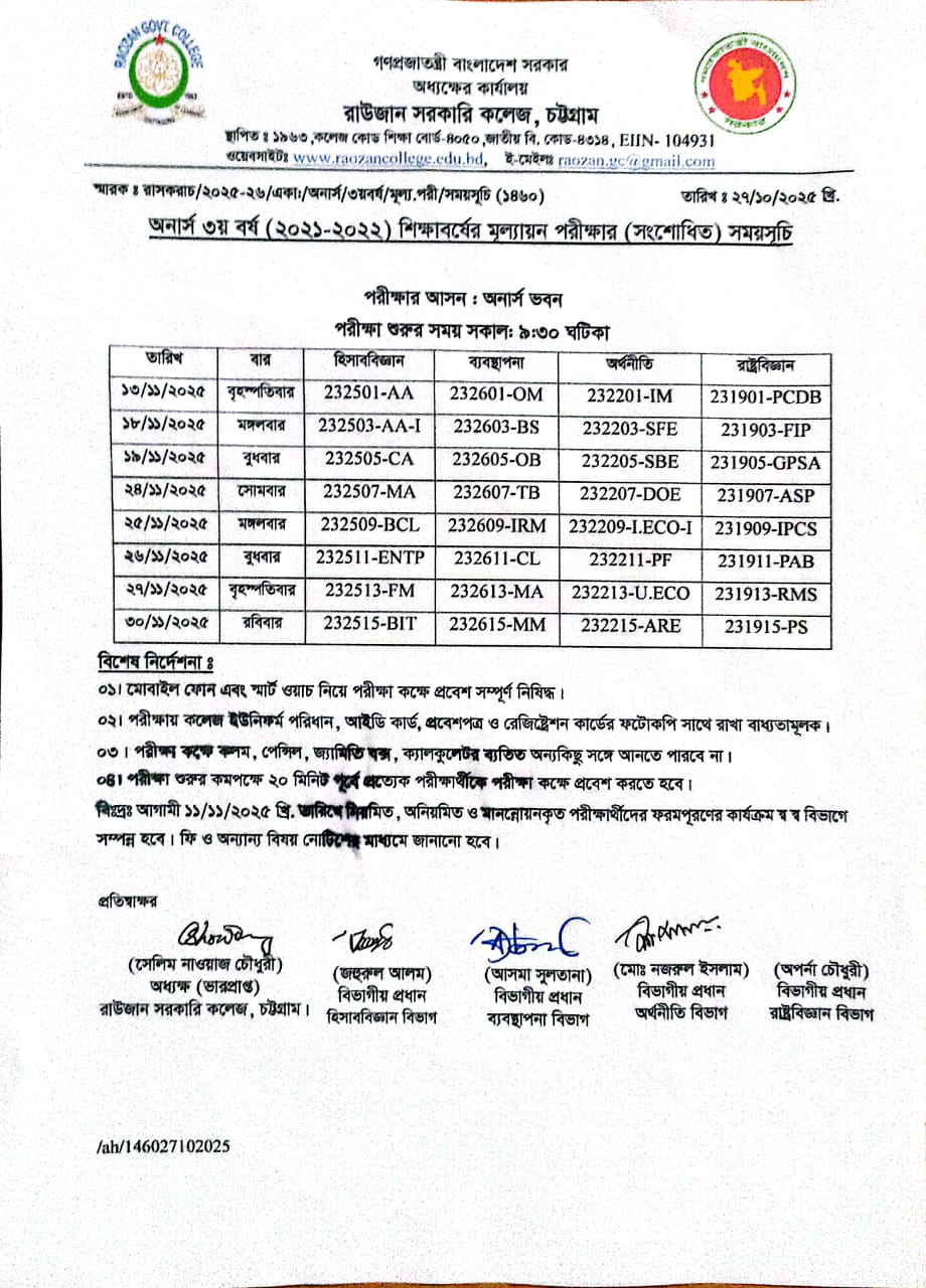 ০২১-২২ শিক্ষাবর্ষের অনার্স ৩য় বর্ষের মূল্যায়ন পরীক্ষার (সংশোধিত) সময়সূচি Published By: | Published on: 27/10/2025