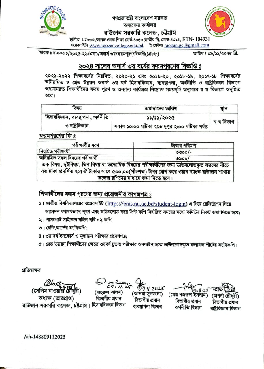 অনার্স ৩য় বর্ষ পরীক্ষা-২০২৪ এর ফরম পূরণ সংক্রান্ত বিজ্ঞপ্তি